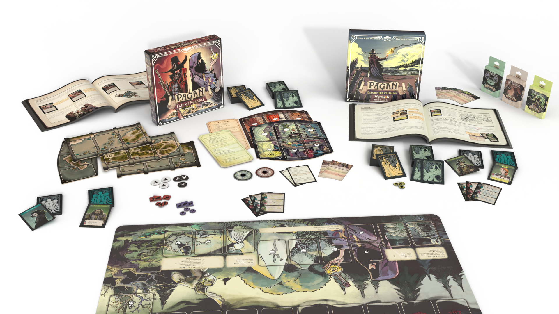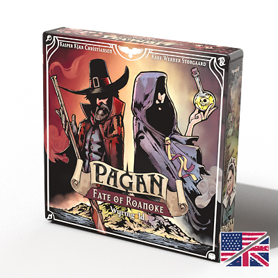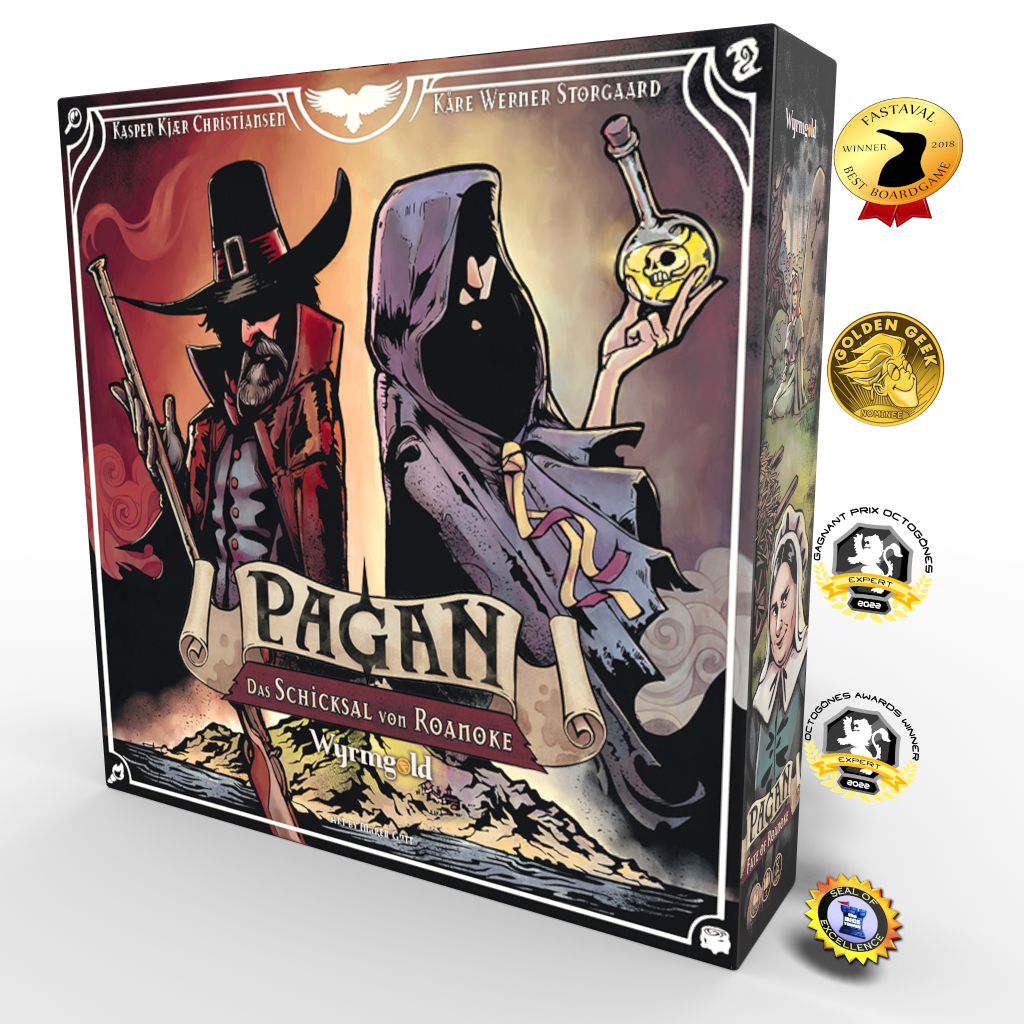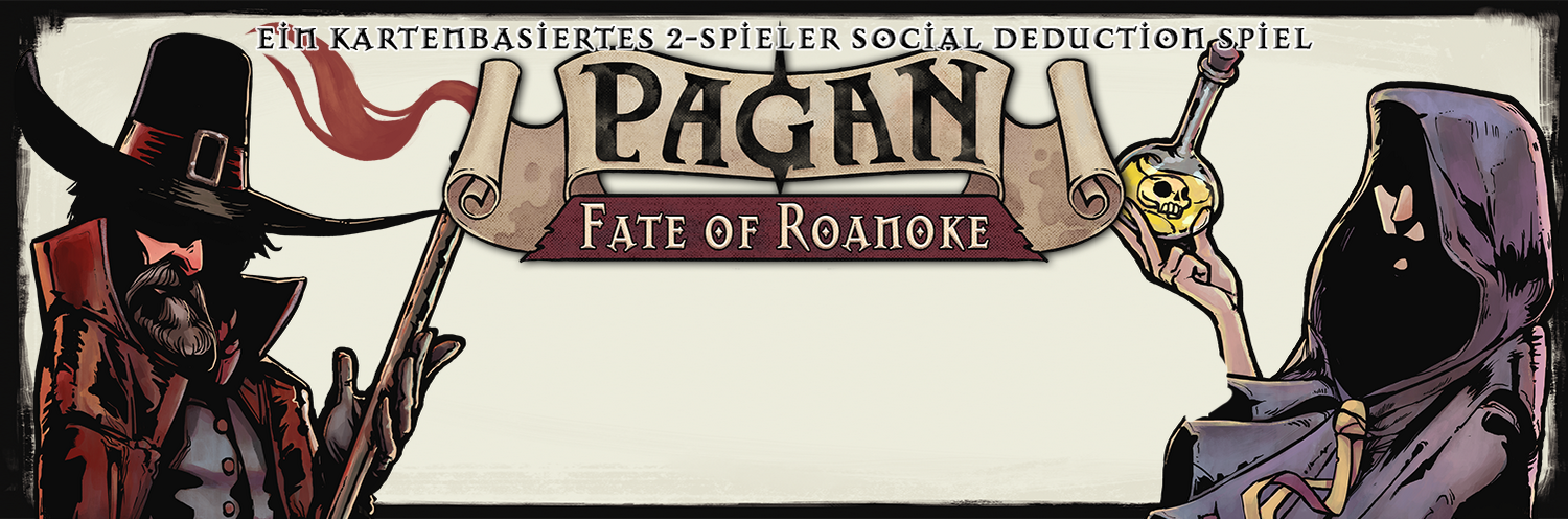 Pagan: Fate of Roanoke von Kasper Christiansen und Kåre Storgaard ist ein Social-deduction-expandable-card-game im kolonialen Amerika des Jahres 1587. Kern des asymmetrischen Spiels ist der Kampf der Hexe gegen den Hexenjäger. Während die Hexe ein Ritual anstrebt, versucht der Jäger ihr auf die Schliche zu kommen und ihre wahre Identität zu erfahren. Dabei greifen die beiden Spieler auf variable Kartendecks von je 50 Karten und verschiedene Ressourcen zu, um die Gegenseite zu besiegen. Viele unterschiedliche Taktiken und Strategien sind möglich und nötig, um in diesem kompetitiven Kampf der Mächte zu bestehen. Eingebettet in die düsteren Grafiken von Illustratorin Maren Gutt erwacht die fiktive Geschichte um die verlorene Kolonie auf der Insel Roanoke zum Leben.